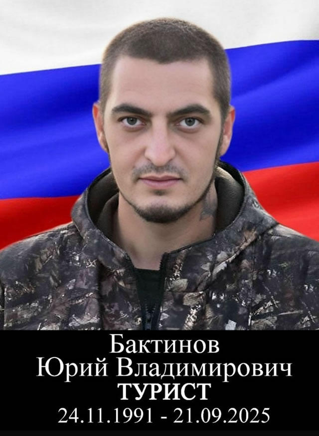 В ходе СВО в Украине (г. Лисичанск) при выполнении боевой задачи 21.09.2025 г. героически погиб Бактинов Юрий Владимирович 24.11.1991 г.р., позывной «ТУРИСТ». Искренние соболезнования родным и близким! Воину вечный покой.